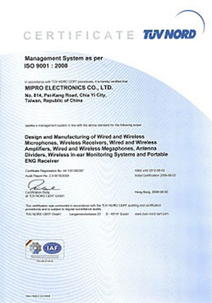 MIPRO is ISO-9001:2008 certified and compliant by Germany's TUV. ISO standard is an international reference for quality management systems. The ISO-9001 quality standard provides a framework by which quality assurance in design, development, production, installation, and servicing is established, documented and maintained.