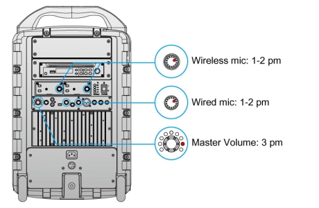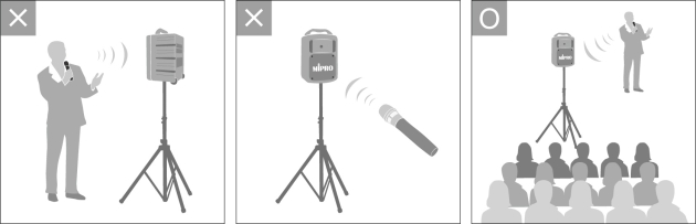 Do not stand directly in front of the speakers; keep mics away from speakers.