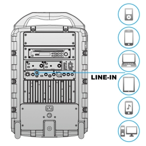 A portable PA system includes an amplifier with a mixer and speaker(s) |